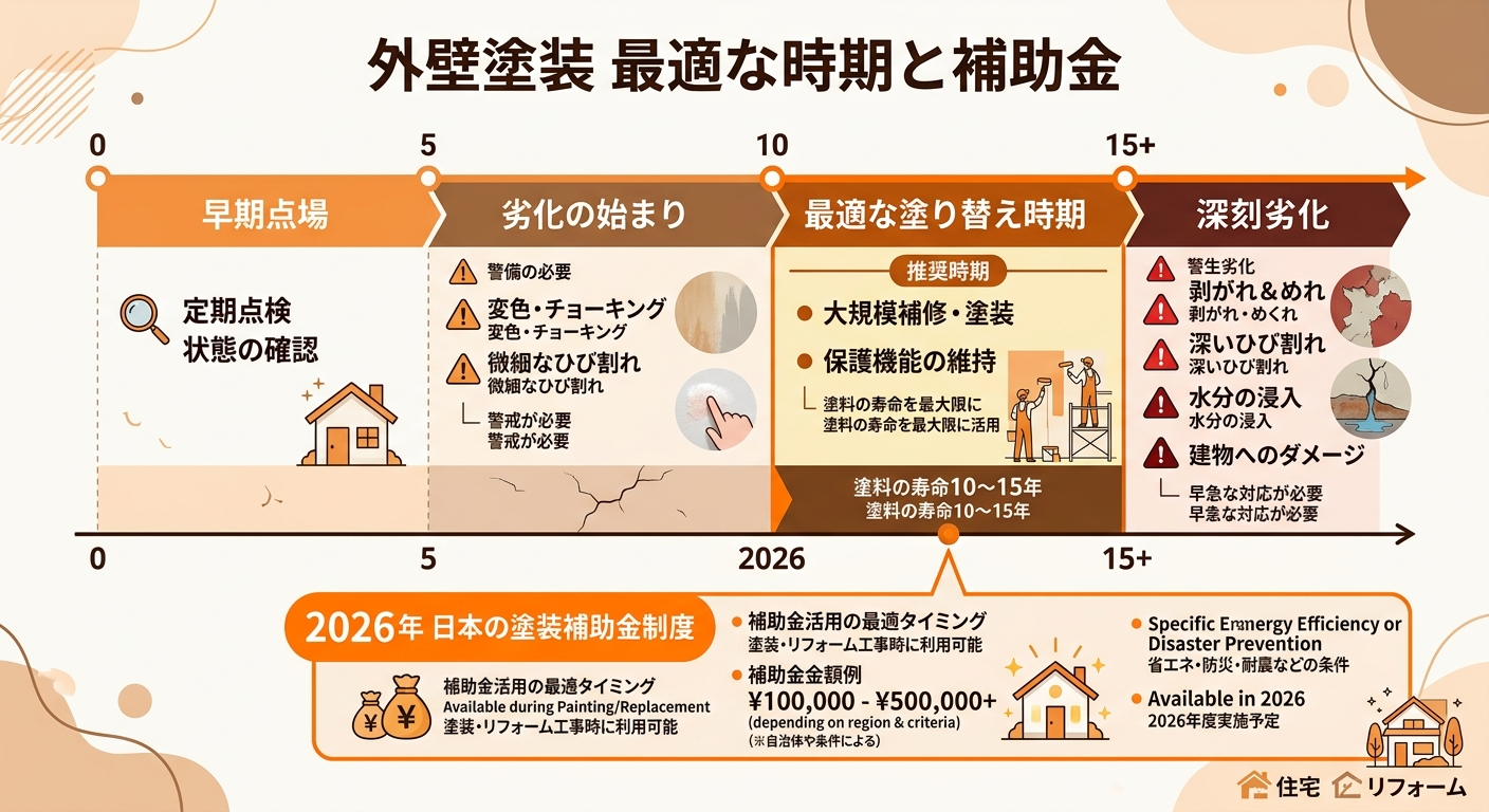 外壁塗装の適切な時期と補助金2026|劣化サイン・費用・節税